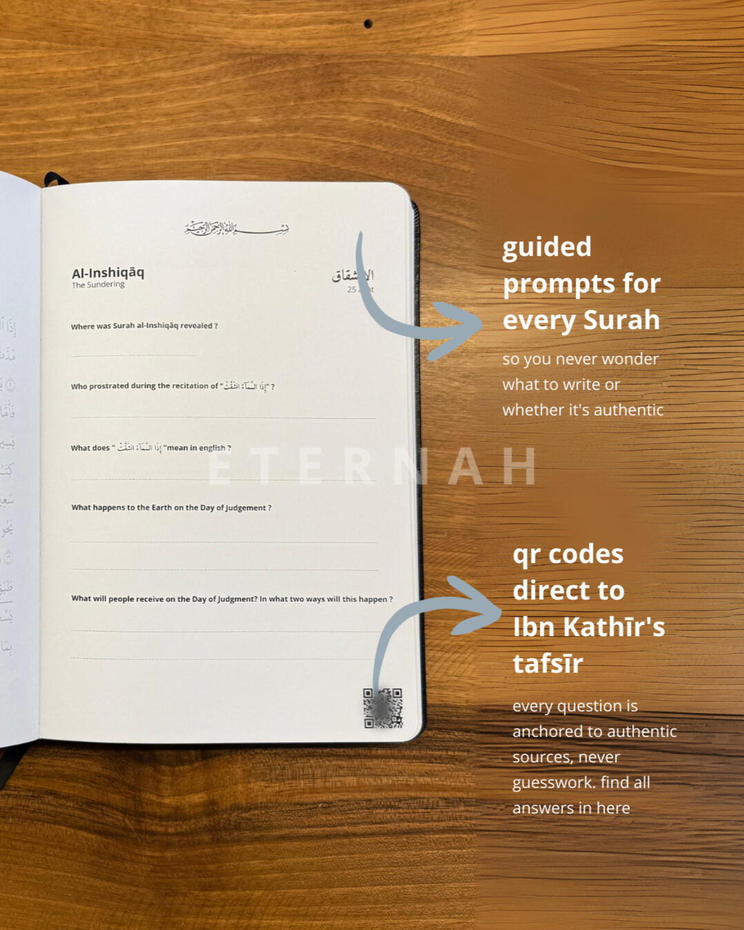 1 Juz. 37 surahs. Guided prompts and QR codes to authentic tafsīr so you never have to wonder what to write or if it’s authentic.