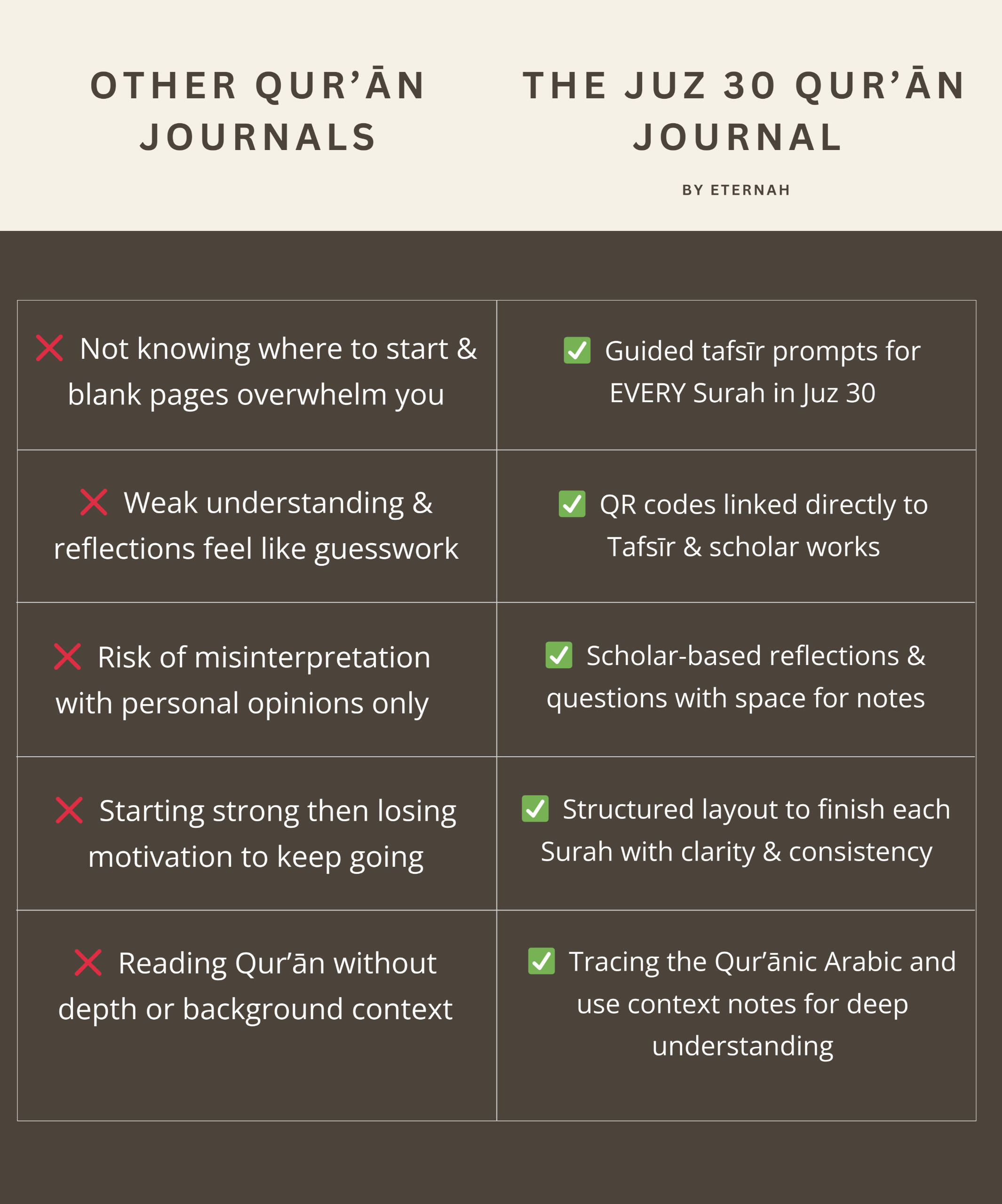 ✔ To finally grasp what each Surah means and the backstories behind themAll of this is not surface level but with depth and context a simple translation can never give you....That's exactly why we created The Juz 30 Qur’ān Journal.By Eternah.